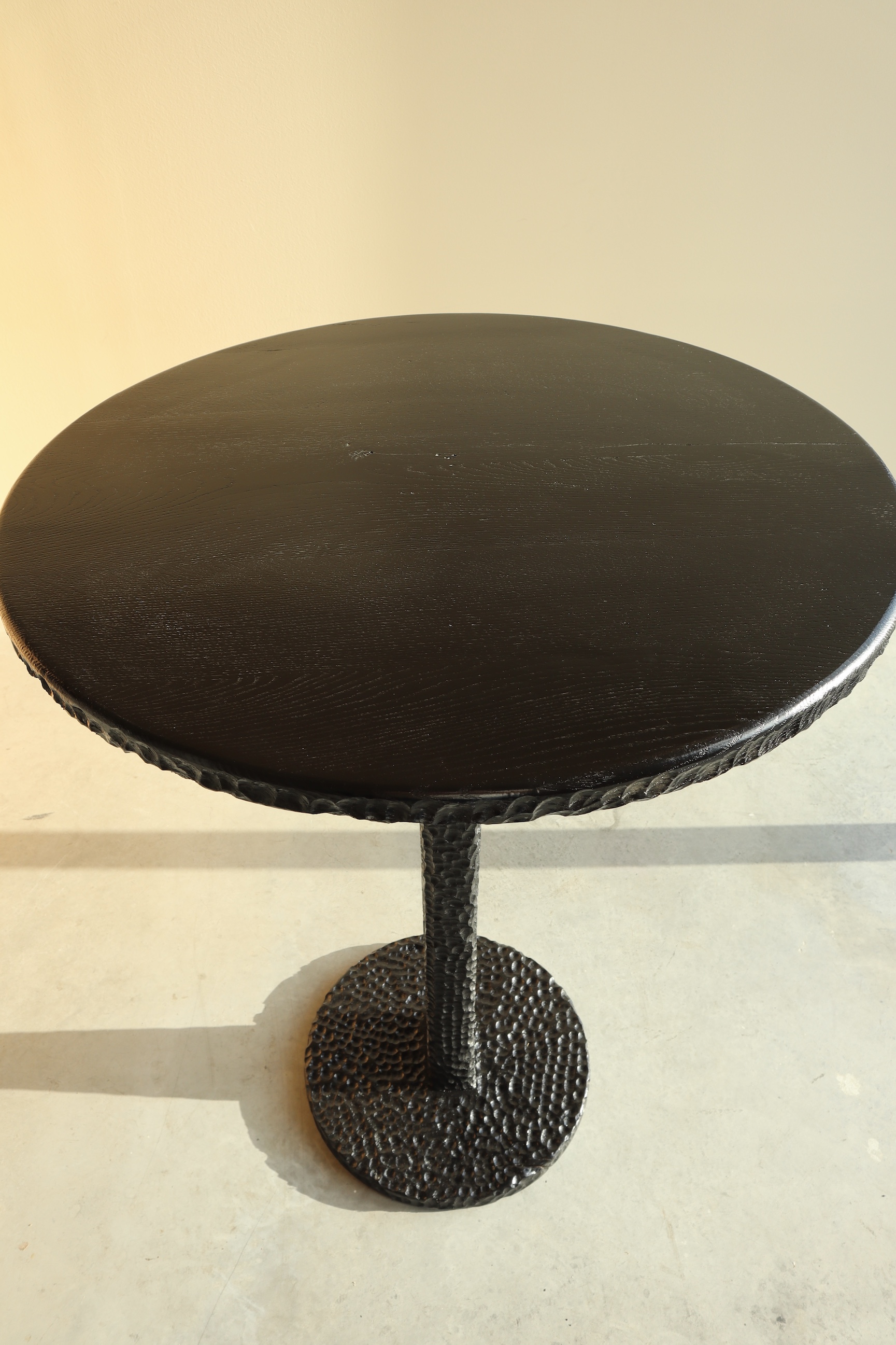 In contrast met het rustige, natuurlijke tafelblad is de onderzijde van het blad en de volledige tafelpoot bewust bewerkt met een structuurafwerking. Deze ambachtelijke texturering zorgt voor een bijzonder tactiel en visueel effect.